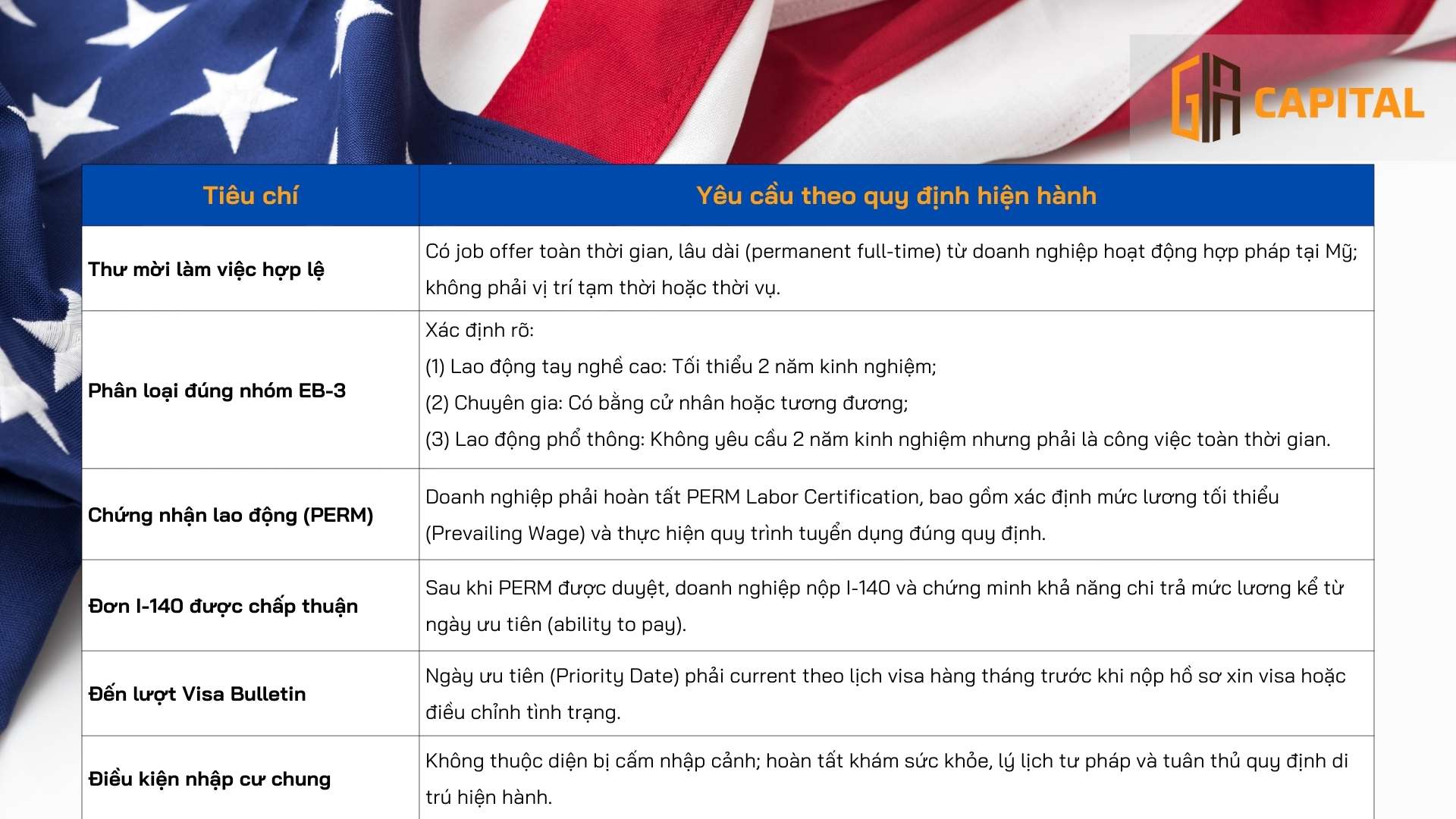 • Hiểu rõ nghĩa vụ làm việc thực tế: EB-3 không phải hình thức “mua thẻ xanh”. Sau khi được cấp visa, đương đơn phải có thiện chí làm việc đúng vị trí đã được bảo lãnh theo thỏa thuận ban đầu.