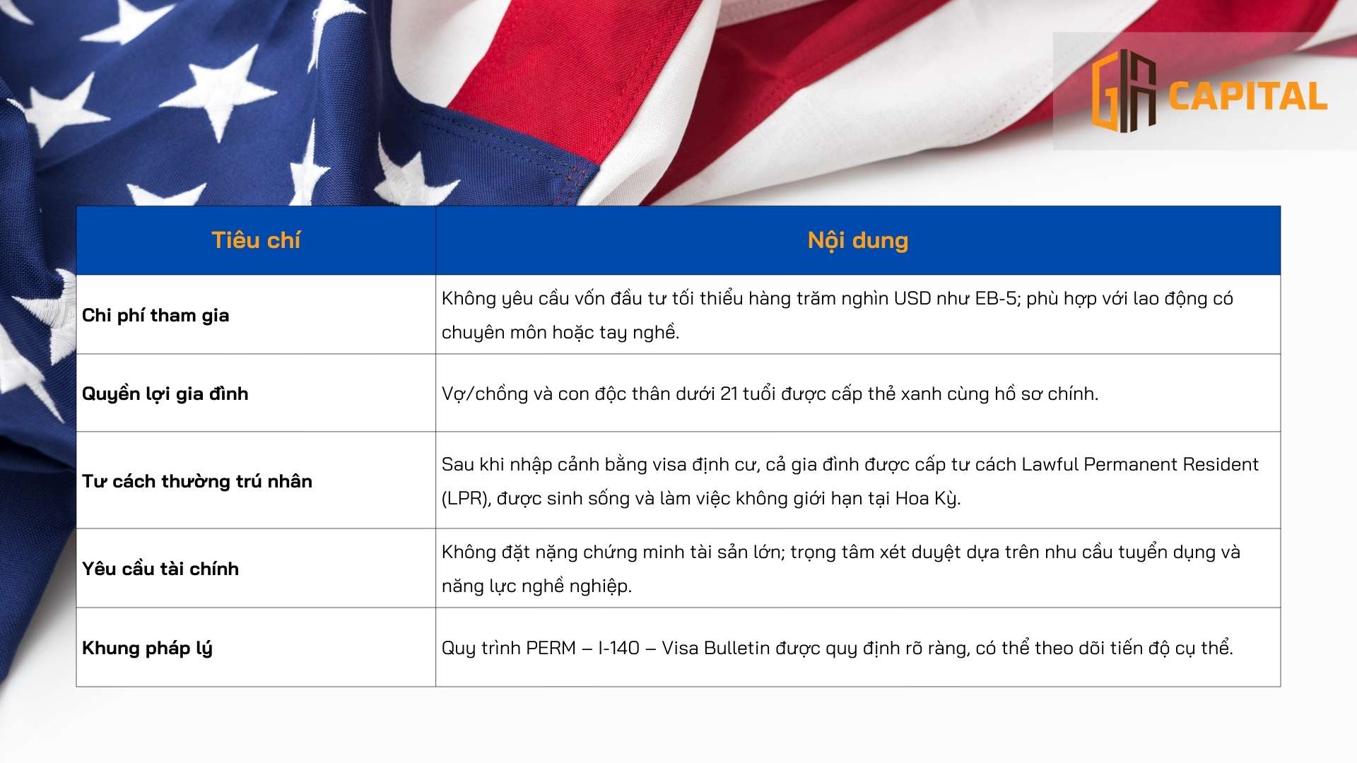 Ở góc độ chi phí và điều kiện tham gia, định cư Mỹ EB-3 mở ra cơ hội cho nhiều gia đình không có nhu cầu đầu tư lớn. Tuy nhiên, lợi thế của chương trình không chỉ nằm ở mức tài chính ban đầu mà còn ở cơ chế pháp lý rõ ràng.