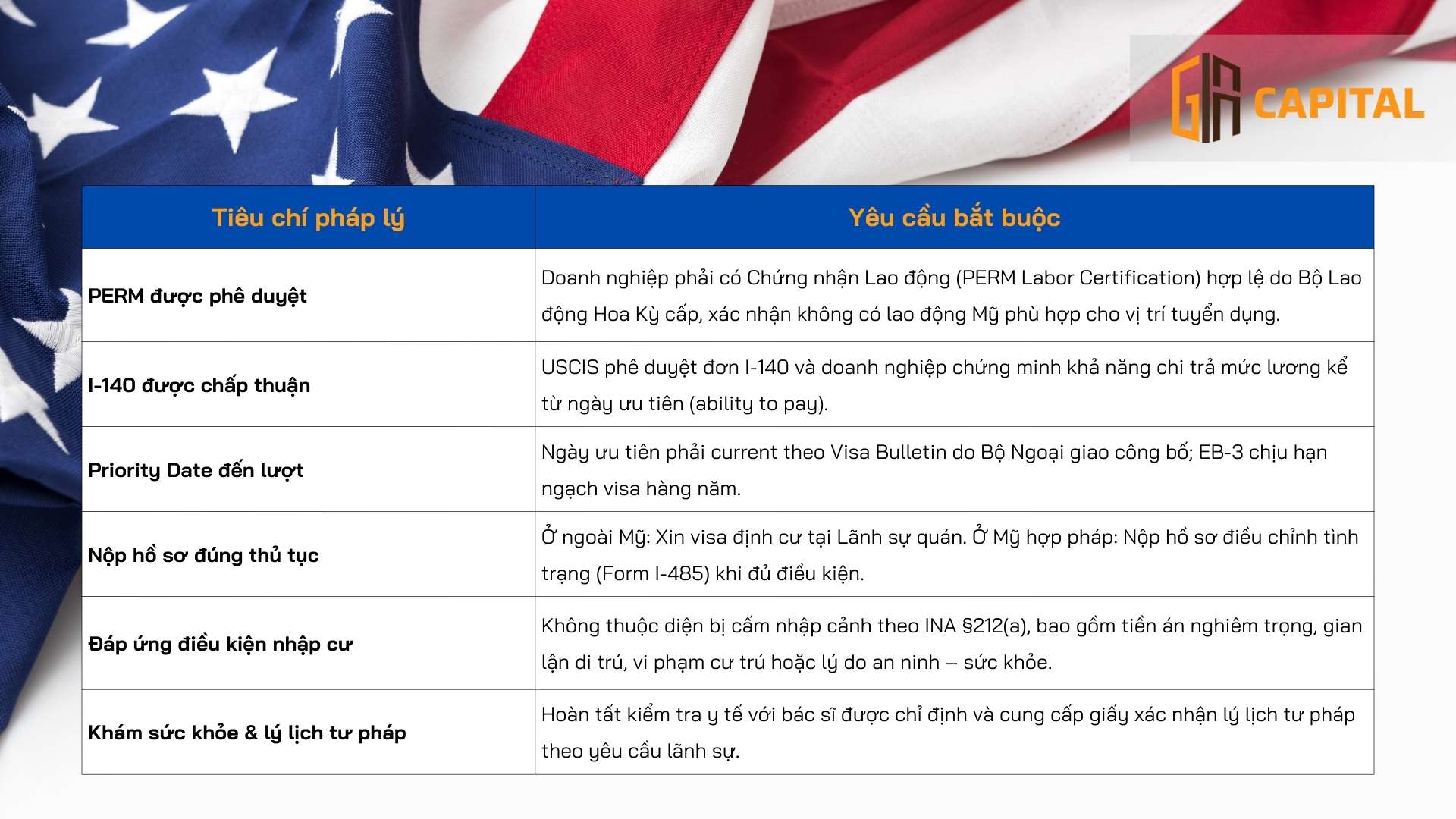 Theo Đạo luật Di trú và Nhập tịch Hoa Kỳ (Immigration and Nationality Act – INA §203(b)(3)), định cư Mỹ EB-3 là diện ưu tiên thứ ba trong nhóm định cư dựa trên việc làm (Employment-Based Immigration). Để tham gia chương trình này, hồ sơ phải đáp ứng đồng thời các điều kiện pháp lý đối với người lao động, doanh nghiệp bảo lãnh, và quy trình xét duyệt của cơ quan chức năng Hoa Kỳ.
