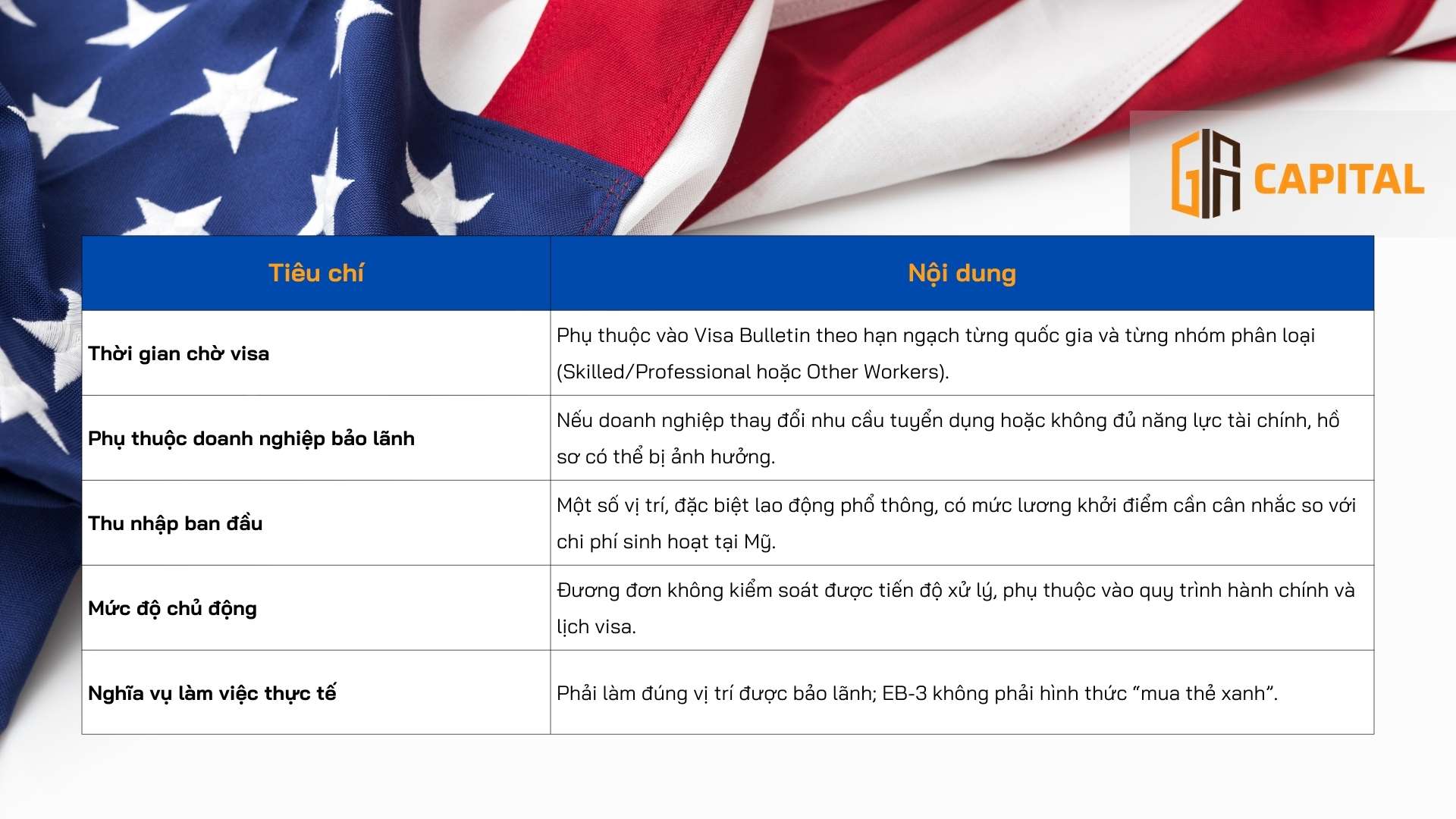 Bên cạnh những điểm tích cực, EB-3 cũng có những giới hạn cần nhìn nhận thẳng thắn. Đây không phải là chương trình dành cho mọi đối tượng, đặc biệt với những người mong muốn sự linh hoạt cao.