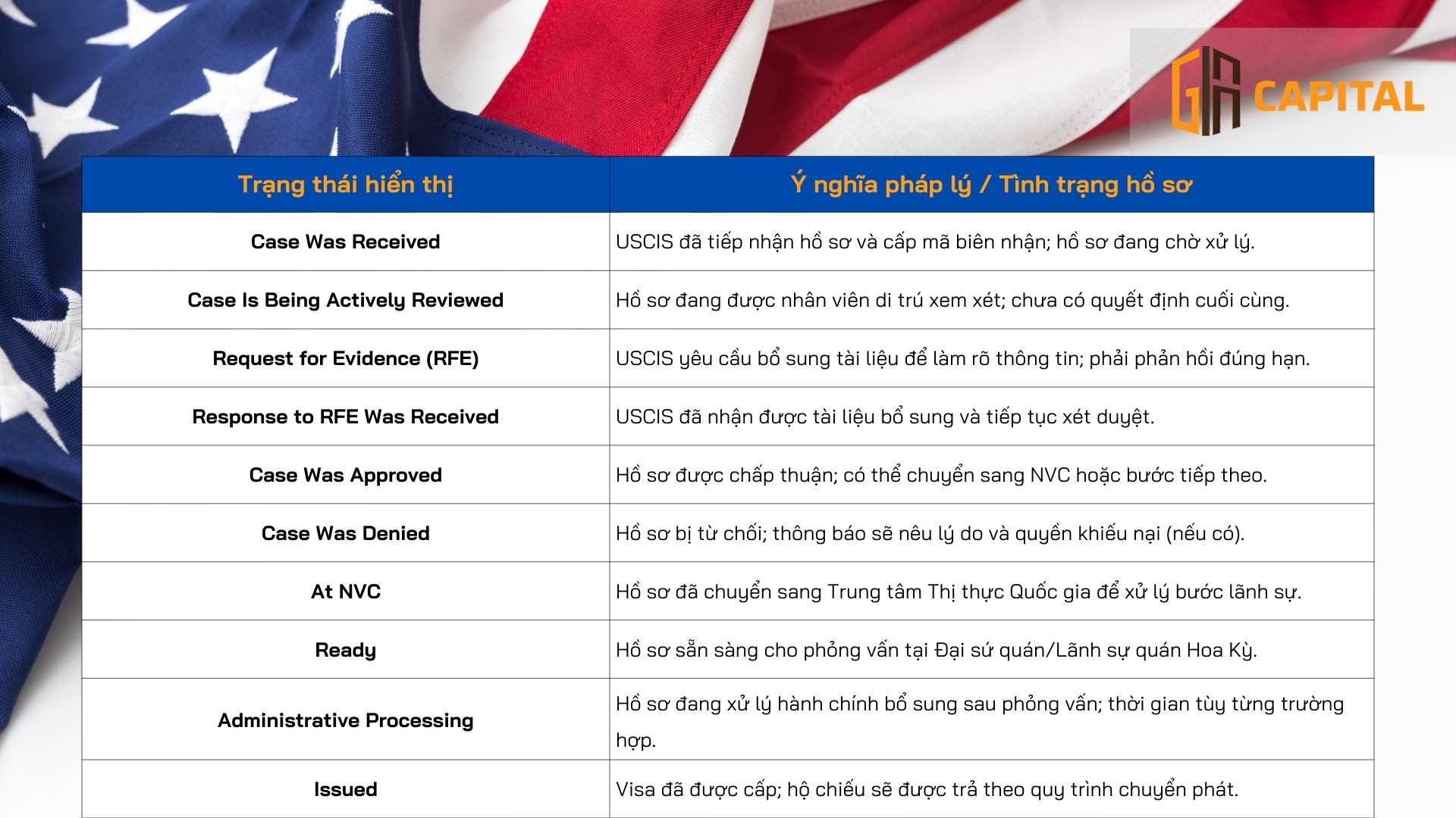 Gia Capital tập trung đọc đúng ngữ cảnh hồ sơ, đối chiếu với mốc processing time/inquiry date, và giải thích rõ tác động của từng trạng thái (đặc biệt với RFE/Administrative Processing) để nhà đầu tư EB-5 chủ động kế hoạch tài chính và lịch trình gia đình.