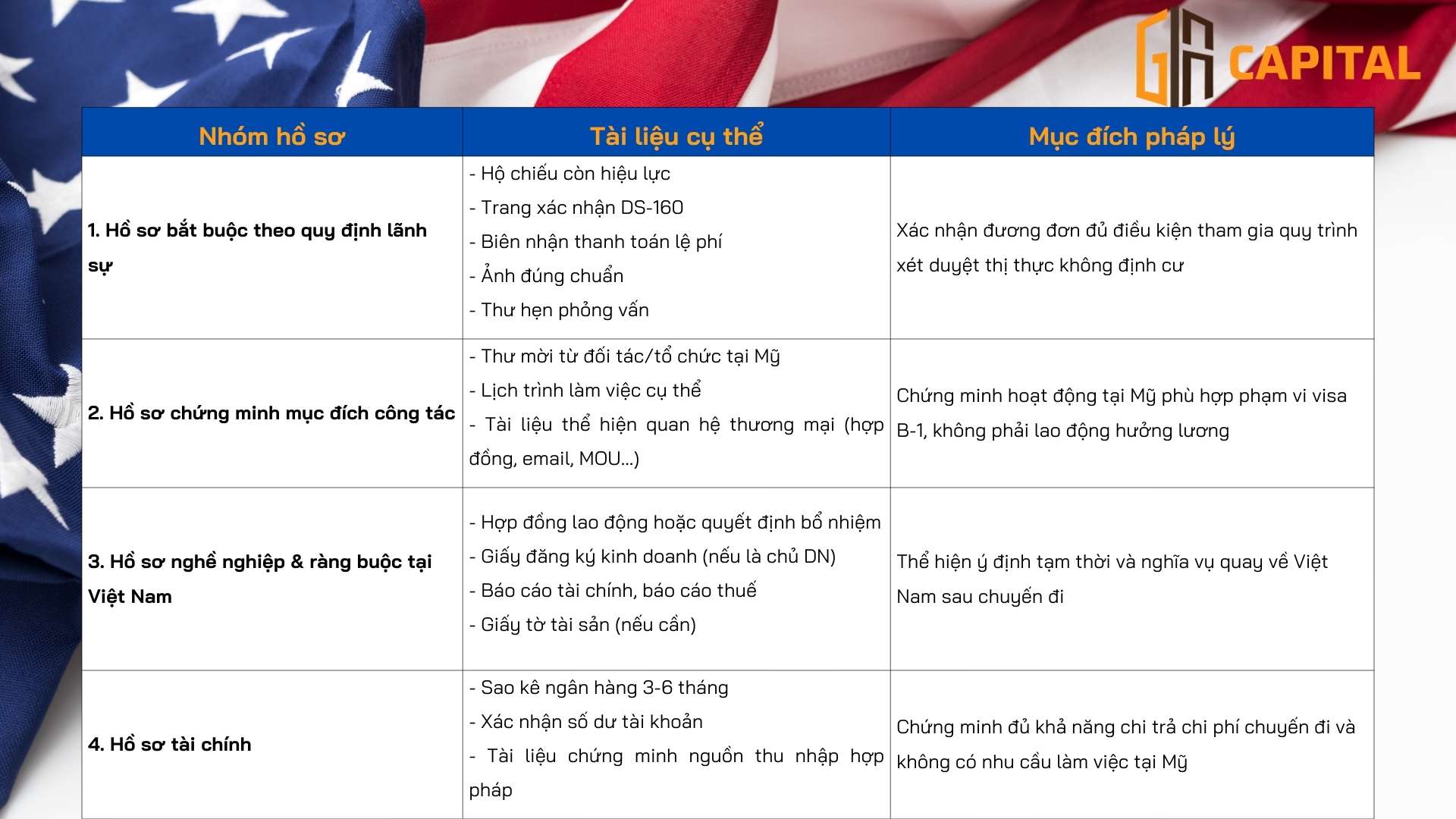 Dưới góc độ pháp lý, visa đi công tác Mỹ thuộc diện không định cư, vì vậy cơ quan lãnh sự sẽ tập trung đánh giá mục đích chuyến đi, mức độ ràng buộc tại Việt Nam và tính minh bạch của hồ sơ tài chính.