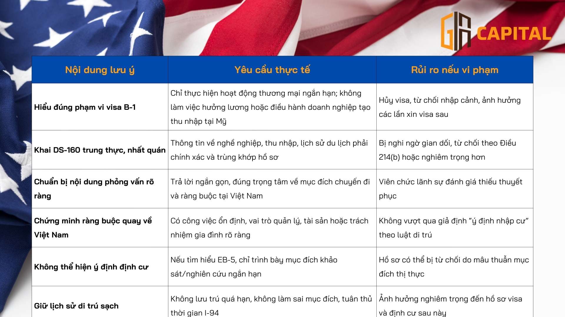 Dưới đây là bảng tổng hợp các lưu ý quan trọng khi xin visa công tác Mỹ (B-1), đặc biệt dành cho doanh nhân và nhà đầu tư đang cân nhắc lộ trình EB-5. Việc tuân thủ đúng ngay từ giai đoạn thị thực ngắn hạn sẽ giúp bảo vệ hồ sơ di trú dài hạn về sau.