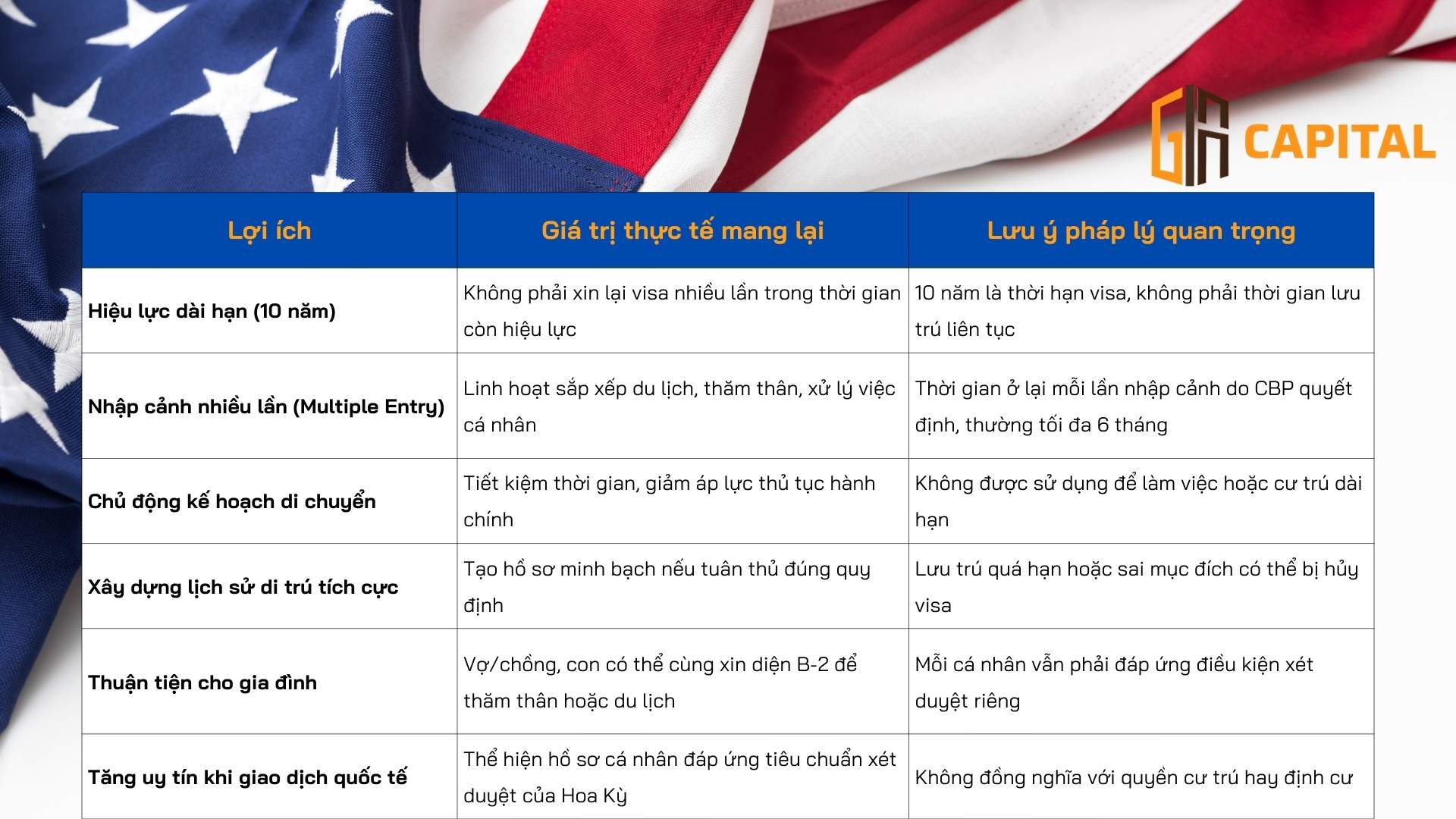 Đối với doanh nhân và gia đình có tần suất di chuyển quốc tế cao, visa Mỹ 10 năm mang lại nhiều thuận lợi về mặt kế hoạch và tính linh hoạt. Tuy nhiên, các lợi ích này cần được hiểu đúng trong phạm vi pháp lý của thị thực không định cư.