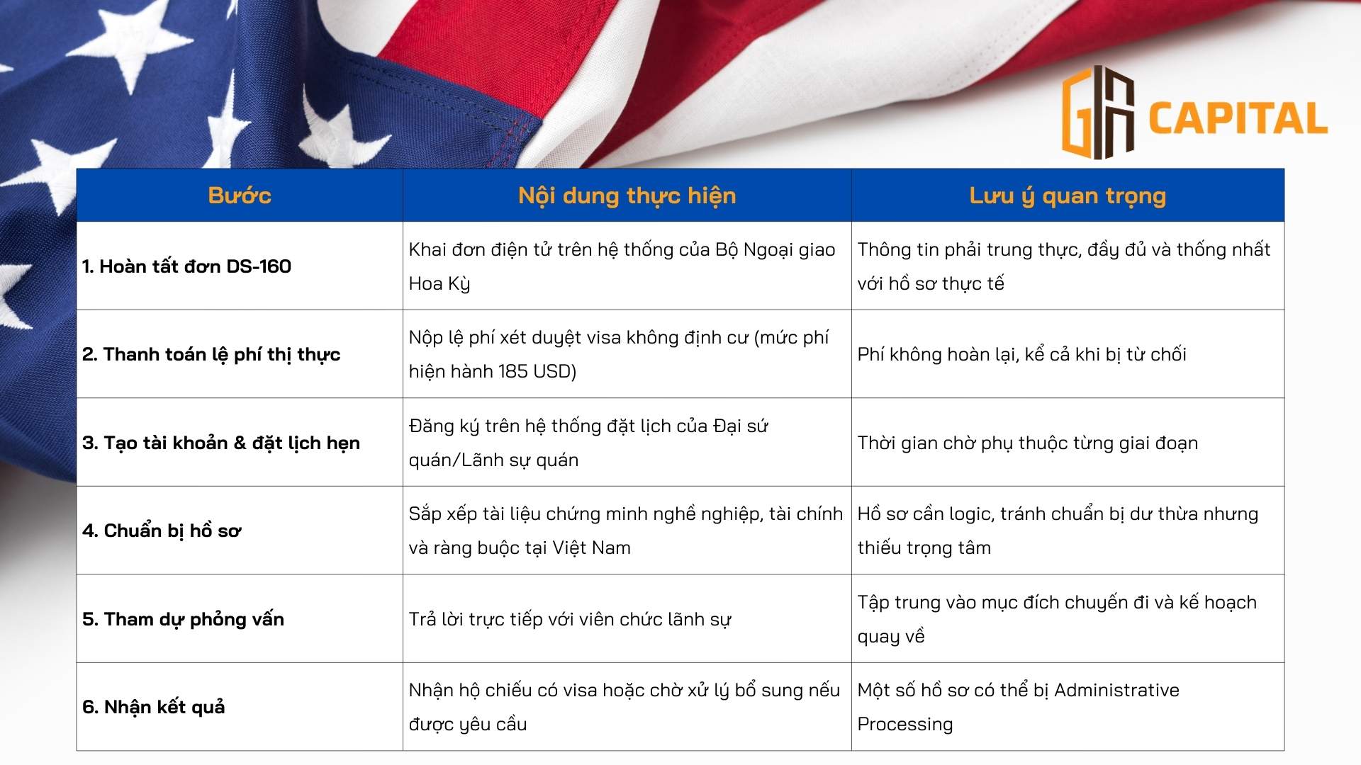 Quy trình xin visa du lịch Mỹ 10 năm được thực hiện theo hệ thống xét duyệt thị thực không định cư của Bộ Ngoại giao Hoa Kỳ. Về cấu trúc, các bước tương đối rõ ràng; tuy nhiên, yếu tố quyết định vẫn nằm ở tính chính xác của thông tin khai báo và khả năng chứng minh ý định tạm thời theo Điều 214(b).