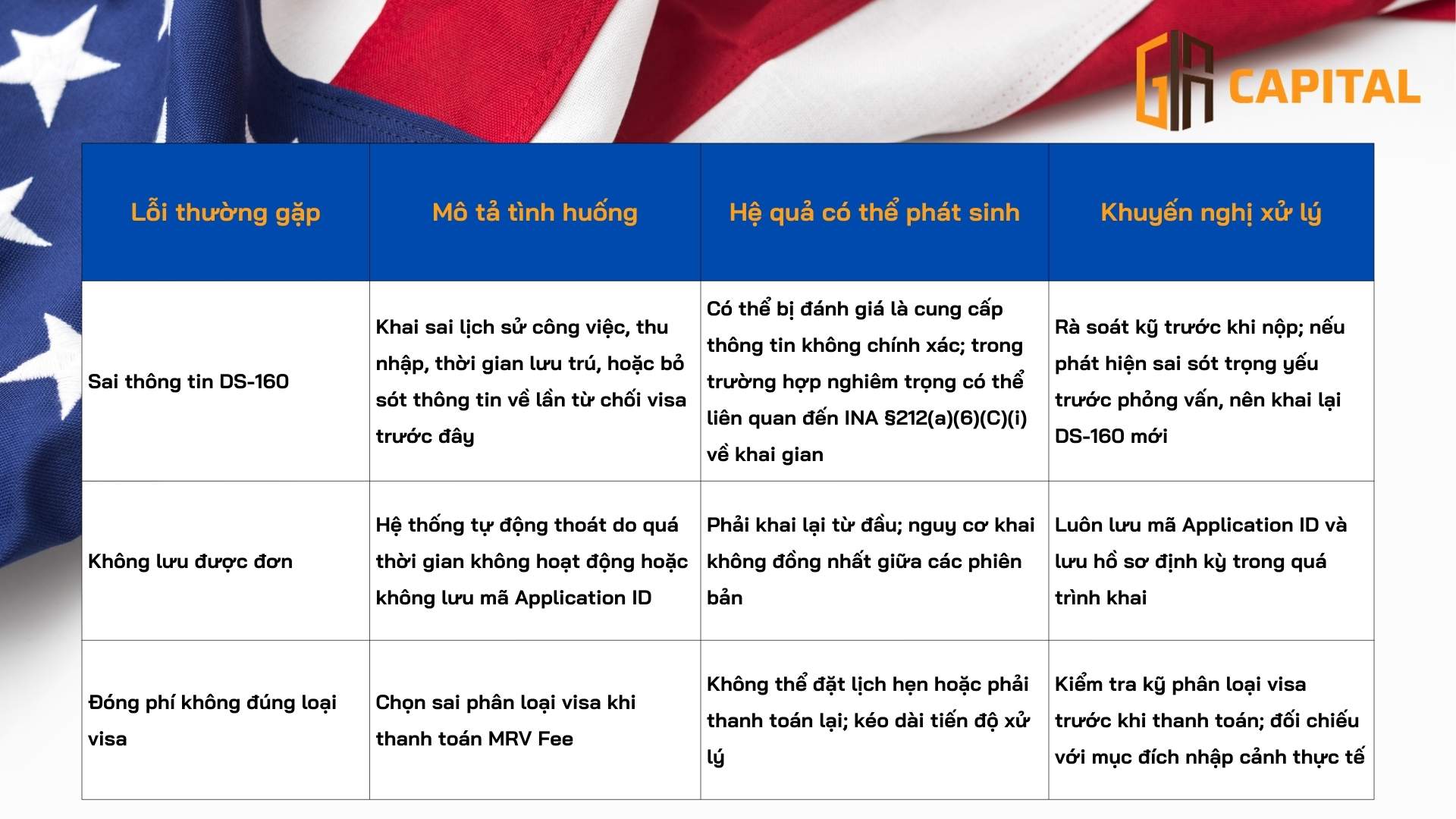 Trong quá trình xin visa Mỹ trực tuyến, sai sót kỹ thuật hoặc khai báo thiếu chính xác có thể ảnh hưởng trực tiếp đến kết quả xét duyệt. Đối với nhà đầu tư EB-5, các lỗi này không chỉ làm chậm tiến độ mà còn có thể tạo ra vấn đề về tính nhất quán dữ liệu trong hệ thống lãnh sự. Dưới đây là các lỗi phổ biến và hệ quả pháp lý tương ứng:
