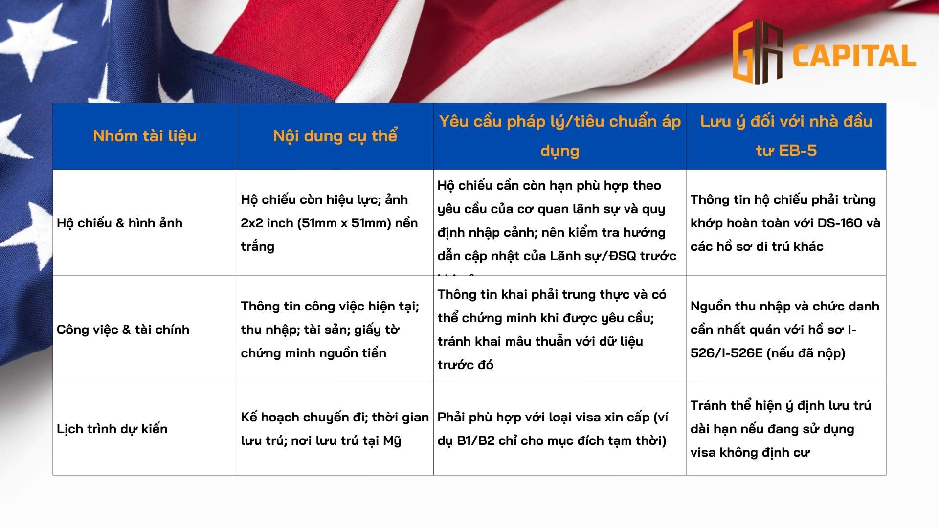 Trước khi tiến hành xin visa Mỹ online và khai mẫu DS-160, việc chuẩn bị đầy đủ tài liệu nền tảng là bước quan trọng nhằm bảo đảm thông tin khai báo chính xác và nhất quán. Đối với nhà đầu tư EB-5, các tài liệu này không chỉ phục vụ buổi phỏng vấn visa không định cư mà còn cần phù hợp với tổng thể hồ sơ di trú dài hạn.